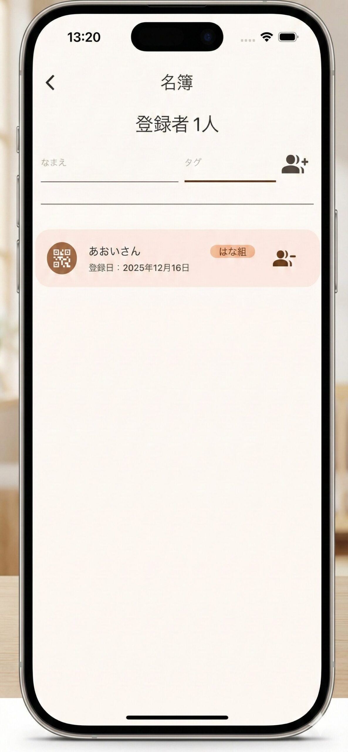 - 名簿画面で対象の園児の左端QRコードアイコンをタップします。