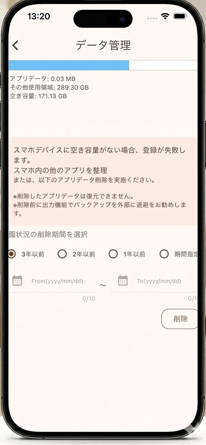 - 端末の空き容量がなくなると、登降園記録の保存に失敗する恐れがあるため、容量が大きくなったら定期的なメンテナンスをおすすめします。