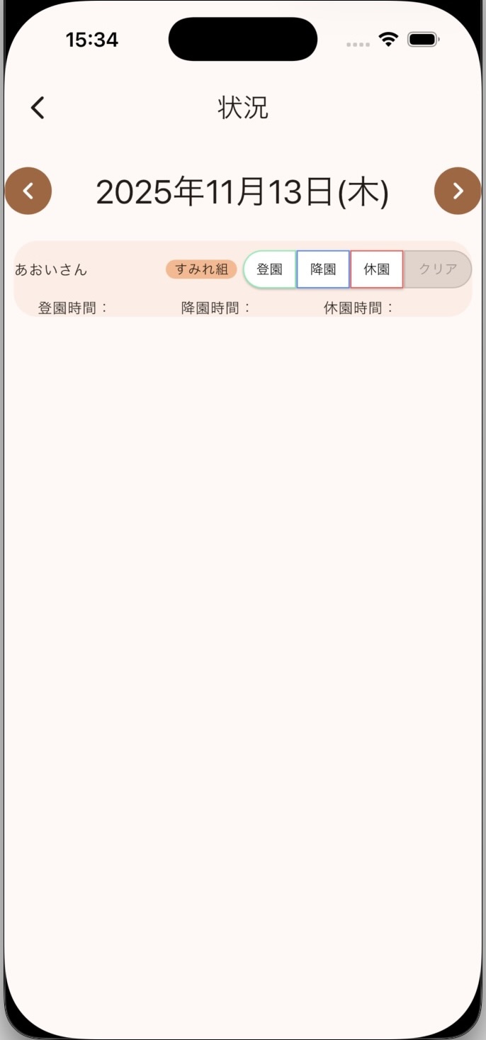 ・園児リストの各行に表示される**「登園」「降園」「休園」**ボタンを手動でタップすることで、ステータスを更新できます。